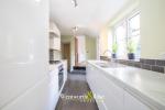 The ground floor comprises two spacious reception rooms, both with large windows and feature fireplaces. The front room benefits from a bay window, while the rear reception has pleasant garden views and flows through to a modern fitted kitchen. The kitchen itself includes a range of white cabinetry, integrated appliances, and tiled splashbacks. Beyond this is a separate utility room with plumbing for laundry and a useful downstairs W.C.