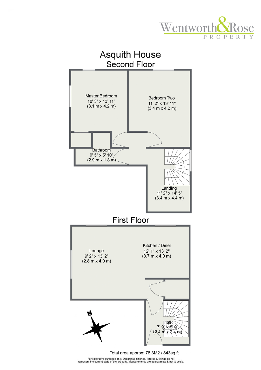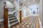 The entrance to Asquith House has retained beautiful Minton tiling and the entrance to the apartment is on the first floor. The entrance hallway of the apartment leads to the stairs going down to the open plan living area and kitchen and also the stairs going up to the bedrooms.