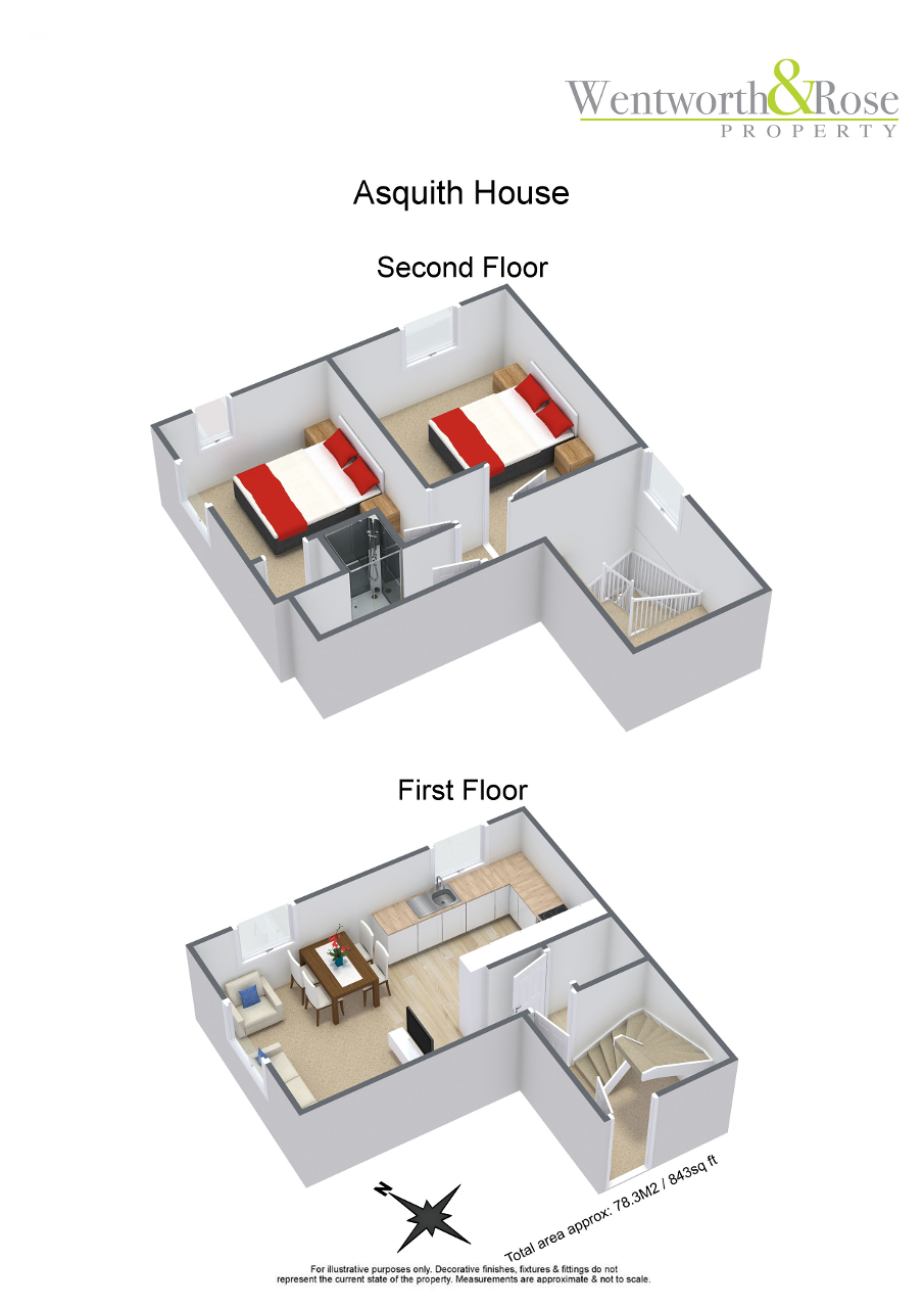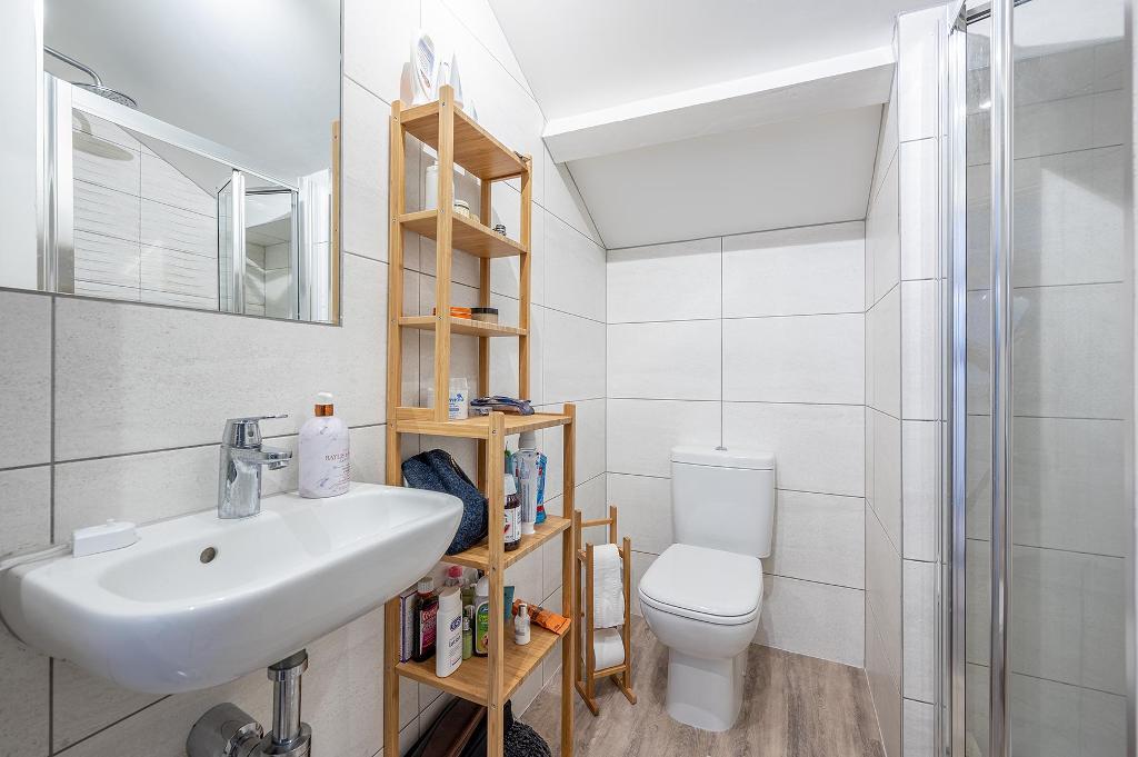 There are 2 good sized double bedrooms. The master bedroom benefits from double aspect windows with bespoke roman curtains fitted. The second double bedroom has views of the rear communal gardens and can easily fit a double bed and function as a study. Part of the landing area of the first floor has been converted into a full length wardrobe and further storage space with a high quality finish. The upstairs toilet has a good-sized walk-in shower fitted.