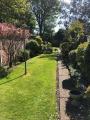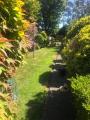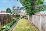 Outside, the garden is accessed via the kitchen and begins with a paved side return and a pathway leading to a deeper lawned section, bordered by mature planting. It offers a private and manageable outdoor space with potential to landscape to suit individual needs.