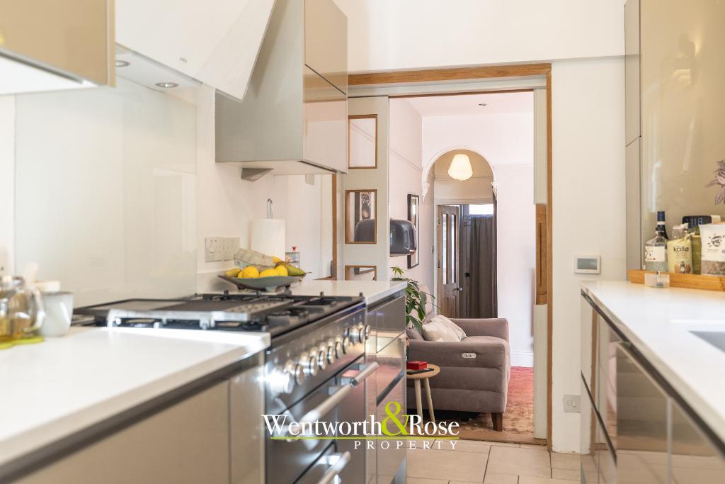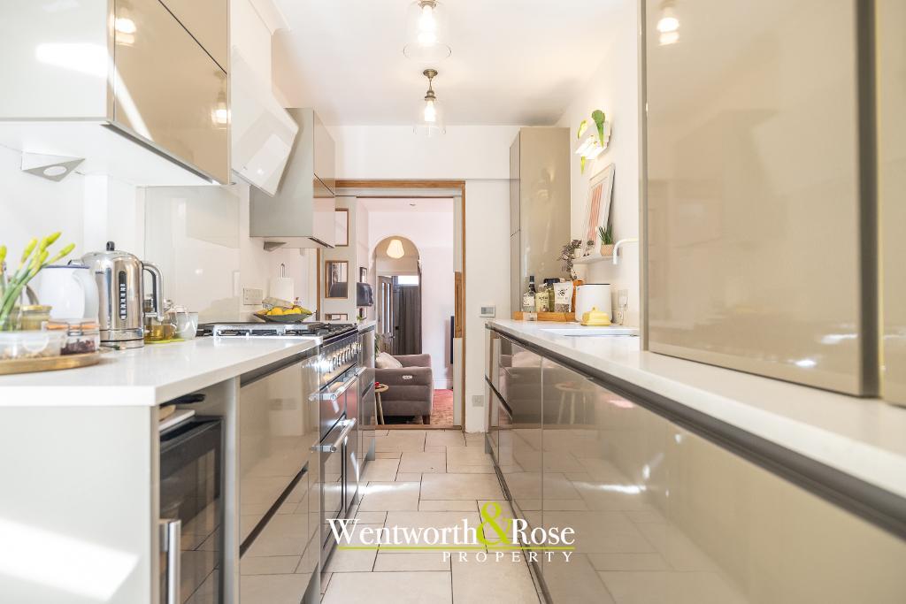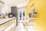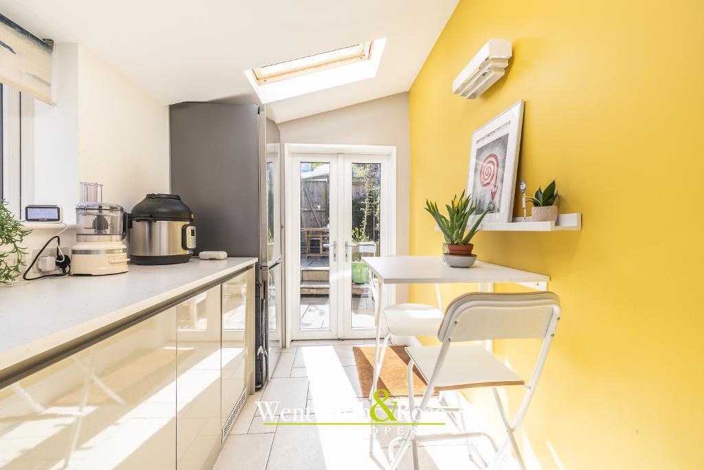 To the rear, the property opens into a generously extended breakfast kitchen that serves as the heart of the home. The long, linear design provides an abundance of worktop and storage space, making it highly functional for cooking and day-to-day living. There is also ample room for informal dining, allowing the kitchen to double as a social space for family meals or casual gatherings. Its position to the rear offers a degree of privacy from the main reception areas, while also creating a natural transition towards the outdoor space. The layout makes it easy to envision a well-organised and efficient kitchen environment that caters to both busy routines and more relaxed occasions.
