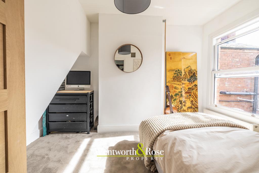 The second floor is dedicated to a spacious third bedroom, set within the roof space and offering a sense of privacy and separation from the rest of the home. This room is particularly versatile and could serve as a principal bedroom, a quiet workspace, or even a hobby or studio area. Its position on the top floor gives it a peaceful atmosphere, making it an ideal retreat within the property. The layout allows for flexible furnishing options, ensuring it can adapt to a variety of lifestyle needs over time.
