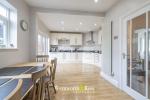 The property is set back from the road behind a large driveway which provides ample off-road parking, as well as an EV charging point and access to the side and garage. On entering the house, the hallway leads to a bright bay-fronted living room and continues through to a superb open-plan kitchen and dining space at the rear. The kitchen is fitted with a range of contemporary units and integrated appliances, complemented by plenty of natural light from patio doors opening to the garden. The adjoining utility area adds practicality, with further access to a guest cloakroom, storage room and the garage, offering flexibility for use as a gym or workshop.