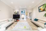 A striking staircase leads to the lower ground floor where a third bedroom with en suite is located. This bedroom enjoys a contemporary finish, complete with automatic skylights and shutters, making it an ideal guest suite or private retreat.