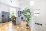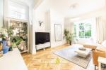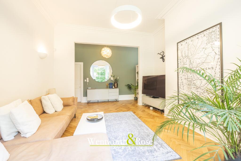 Accessed via a smart communal entrance, the property was comprehensively refurbished in 2020 to an exceptional standard. The entrance level hosts a stylish breakfast kitchen, finished with sleek cabinetry, a central island with seating, and high-quality Bosch integrated appliances including oven, gas hob and dishwasher, along with a washing machine. Large windows offer views over the communal garden, while adjacent sits a spacious living room with tall ceilings, large sash windows, and a real wooden floor which can be re-sanded and varnished many times over, ensuring both longevity and beauty.
