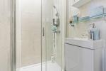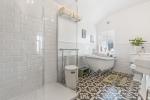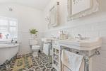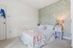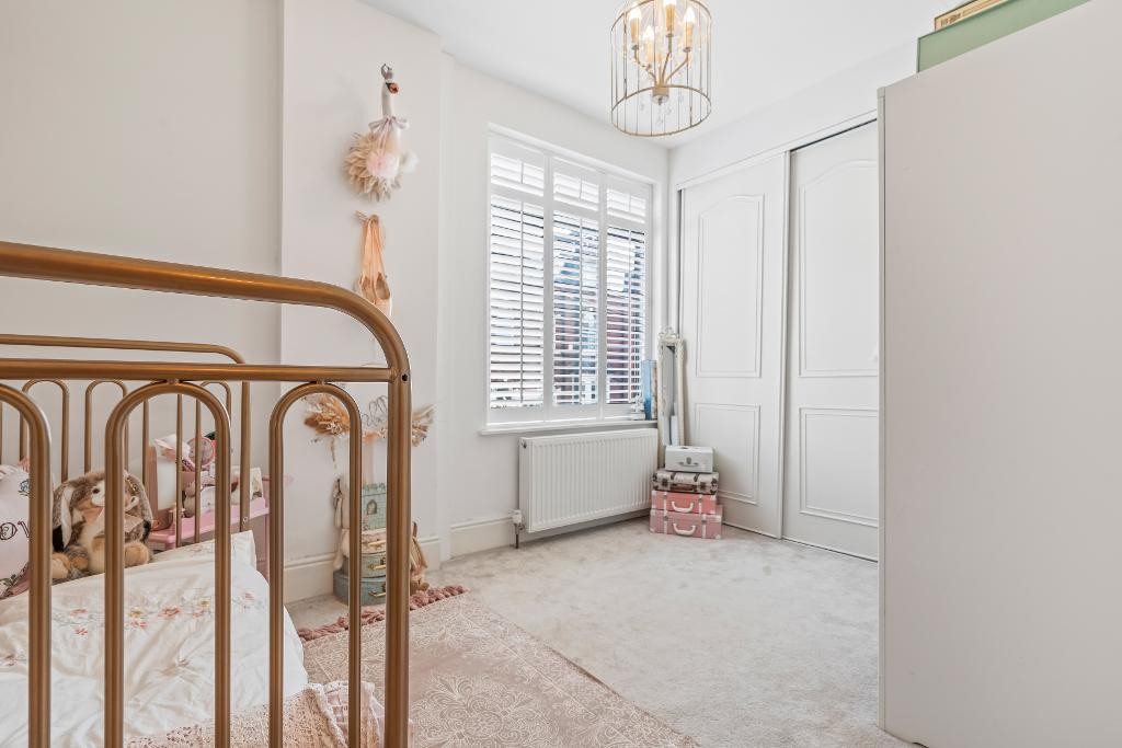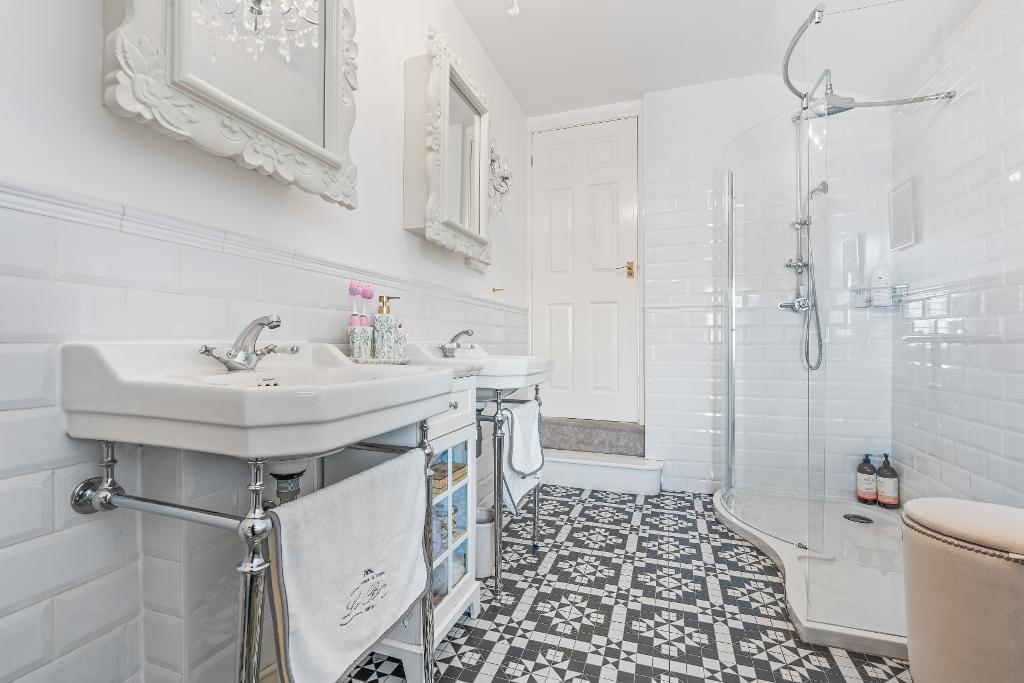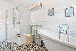 On the first floor, there are two well-proportioned double bedrooms. The main bedroom is positioned at the rear and offers ample space for freestanding wardrobe, while the second bedroom sits at the front with a bespoke French shuttered window and fitted wardrobe. Also on this floor is the large family bathroom, finished to an excellent standard with a freestanding roll-top bath, double Burlington sinks, walk-in shower, and part-tiled walls with heritage-style flooring.