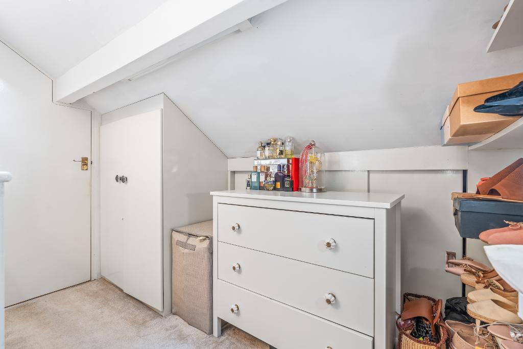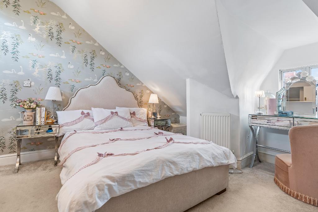 The second floor provides a further double bedroom within a thoughtfully executed loft conversion. This renovated space benefits from sloped ceilings, built-in storage, a skylight, and a stylish Nina Campbell wallpapered feature wall. An en-suite shower room and a separate walk-in wardrobe make excellent use of the space and add further practicality.