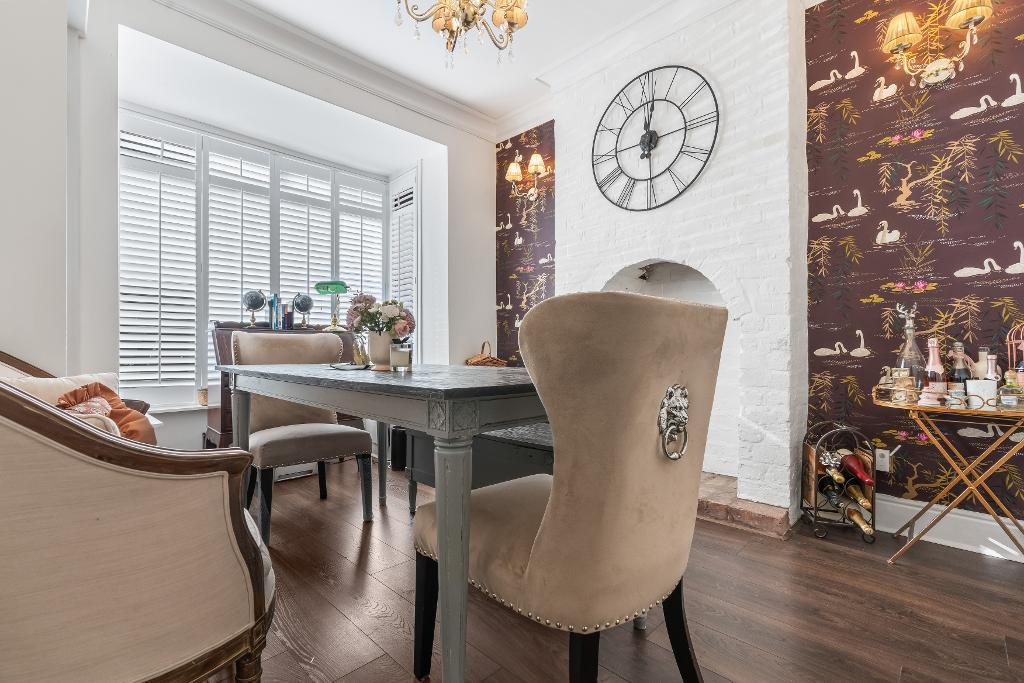 An immaculately presented three-bedroom home arranged over three floors, combining period charm with modern touches throughout. Set behind a low-maintenance fore garden with established planting, the property is entered via a beautiful front door into a traditional hallway with decorative tiled flooring. From here, access is granted to a generously proportioned front reception room with a bay window, bespoke fitted French shutters, high ceilings, and a whitewashed exposed brick chimney breast, offering a subtle focal point to the room. Currently used as a dining room/study, this space provides excellent flexibility for modern living.