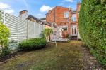 The rear garden offers a blend of lawn and paved sections, with a defined seating area towards the rear framed by mature greenery and climbing plants. A playhouse, established shrubs, and hedging provide both privacy and charm, making it an ideal space for family life or entertaining.