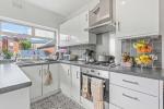 To the rear, a comfortable living room features a central fireplace with decorative surround, period features, and French doors opening directly onto the garden. Adjacent lies a well-appointed kitchen with gloss cabinetry, complementary worktops, tiled splashbacks, and integrated appliances, including oven, hob, and extractor. Dual aspect windows provide plenty of natural light, and a glazed door leads conveniently to the rear garden.
