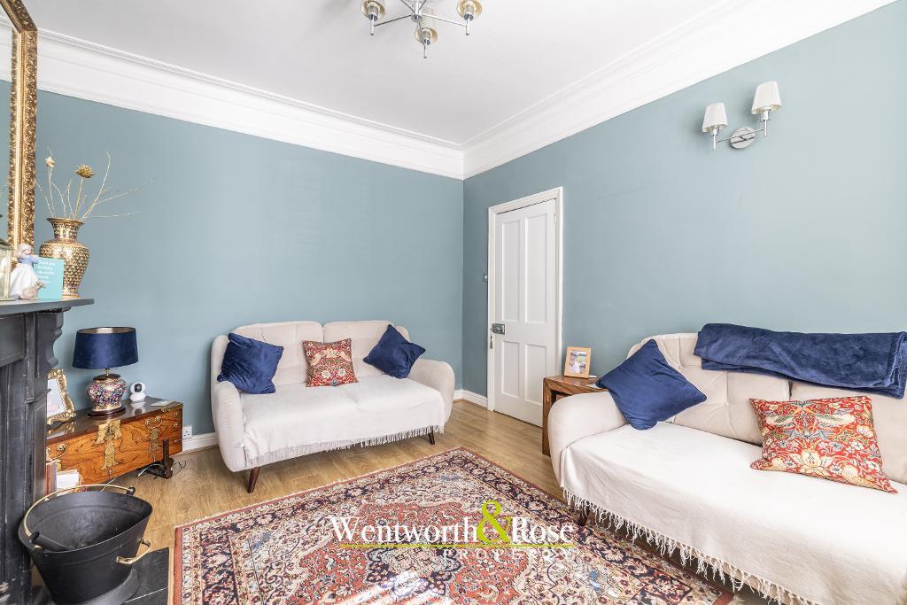 A welcoming hallway sets the tone on arrival, showcasing original Minton tiled flooring and a stained-glass front door. To the front, the living room enjoys an abundance of natural light through a large bay window fitted with shutters and features an open fire set within a striking period fireplace, creating an inviting space to relax. To the rear, the second reception room offers a versatile dining or entertaining space, complete with an additional open fire, built-in storage, and an original wooden floor that adds warmth and character.