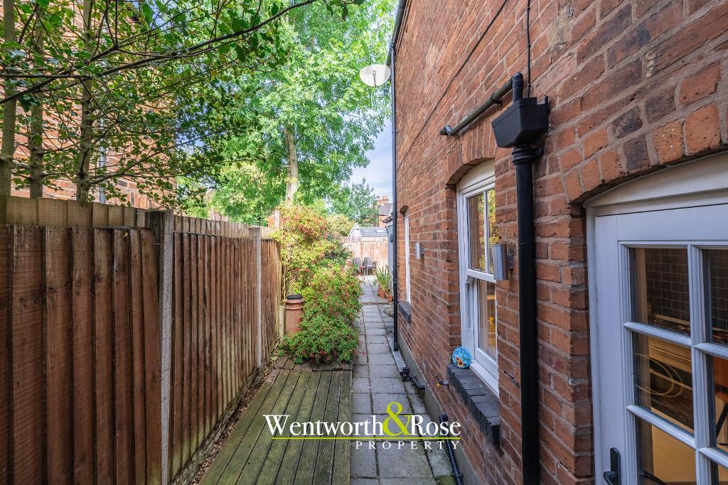 To the rear, the garden provides a private and low-maintenance outdoor space, laid with paving and bordered by mature planting, creating an ideal setting for outdoor dining and relaxation. The property also benefits from a substantial outbuilding with electrics, double French doors, and sash windows, making it a versatile space that would work perfectly as a home office, gym, or creative studio.
