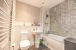 Leading inside, the apartment features a spacious open plan kitchen/diner, designed with modern aesthetics and functionality in mind. Ample storage space in the hallway ensures organisation is effortless. The apartment is spacious throughout with a large bedroom which benefits from built-in wardrobe space. The bathroom is equally well designed with an attractive modern suite and shower-over-bath arrangement.